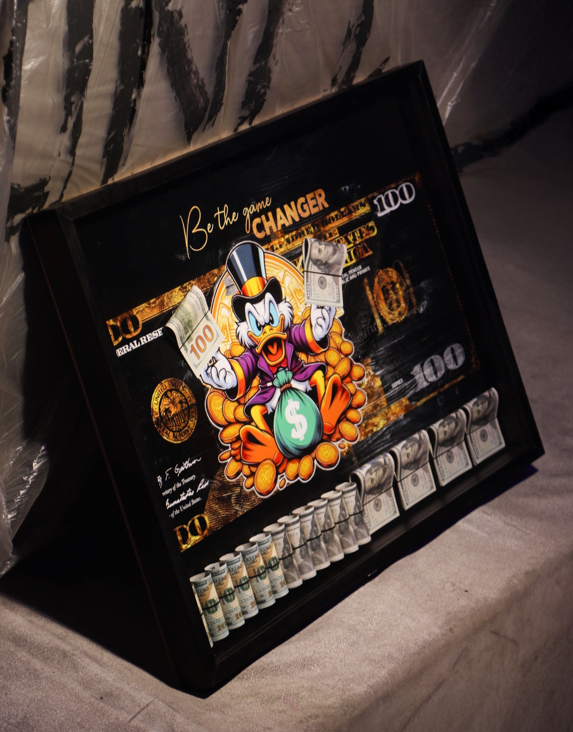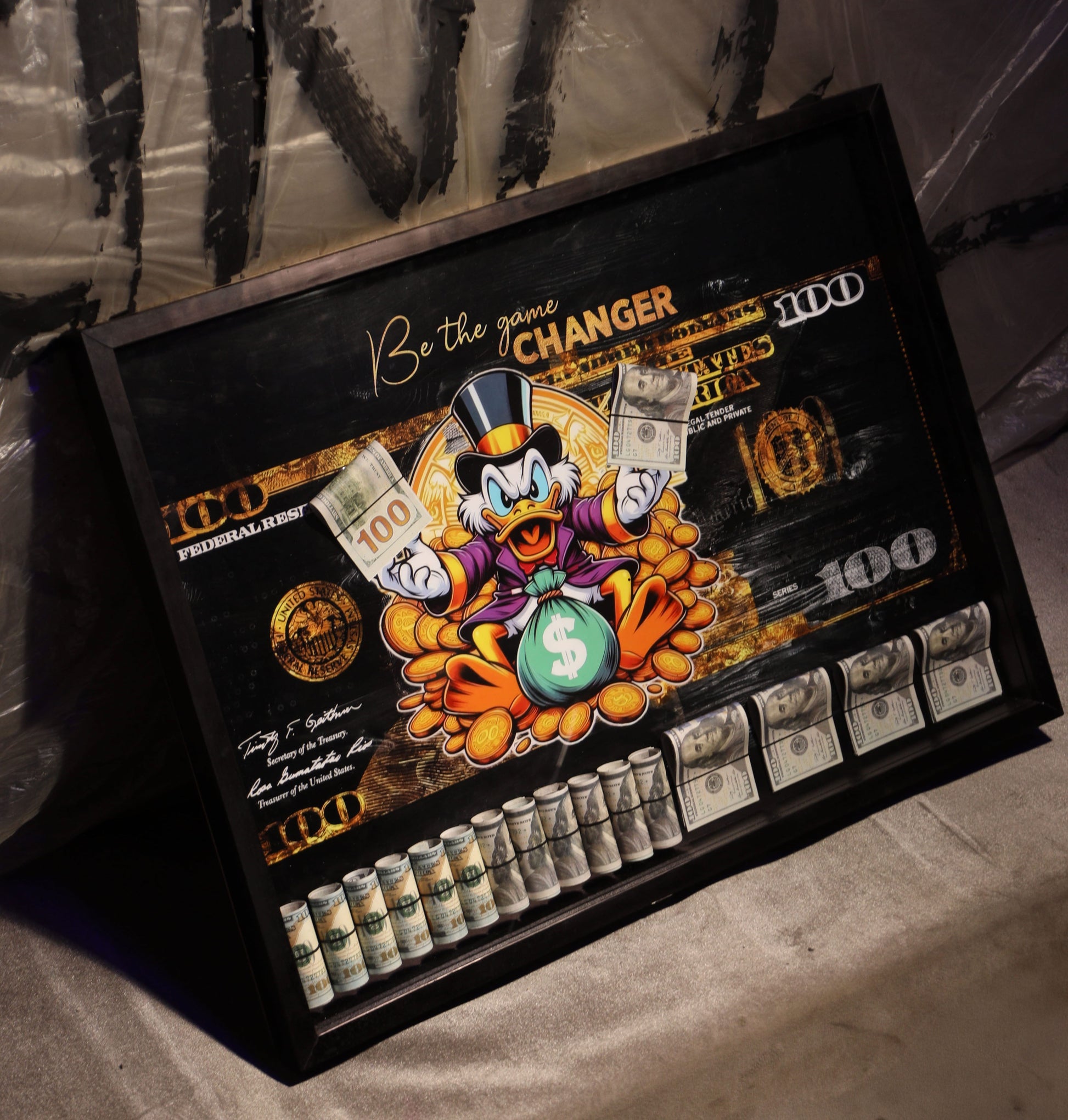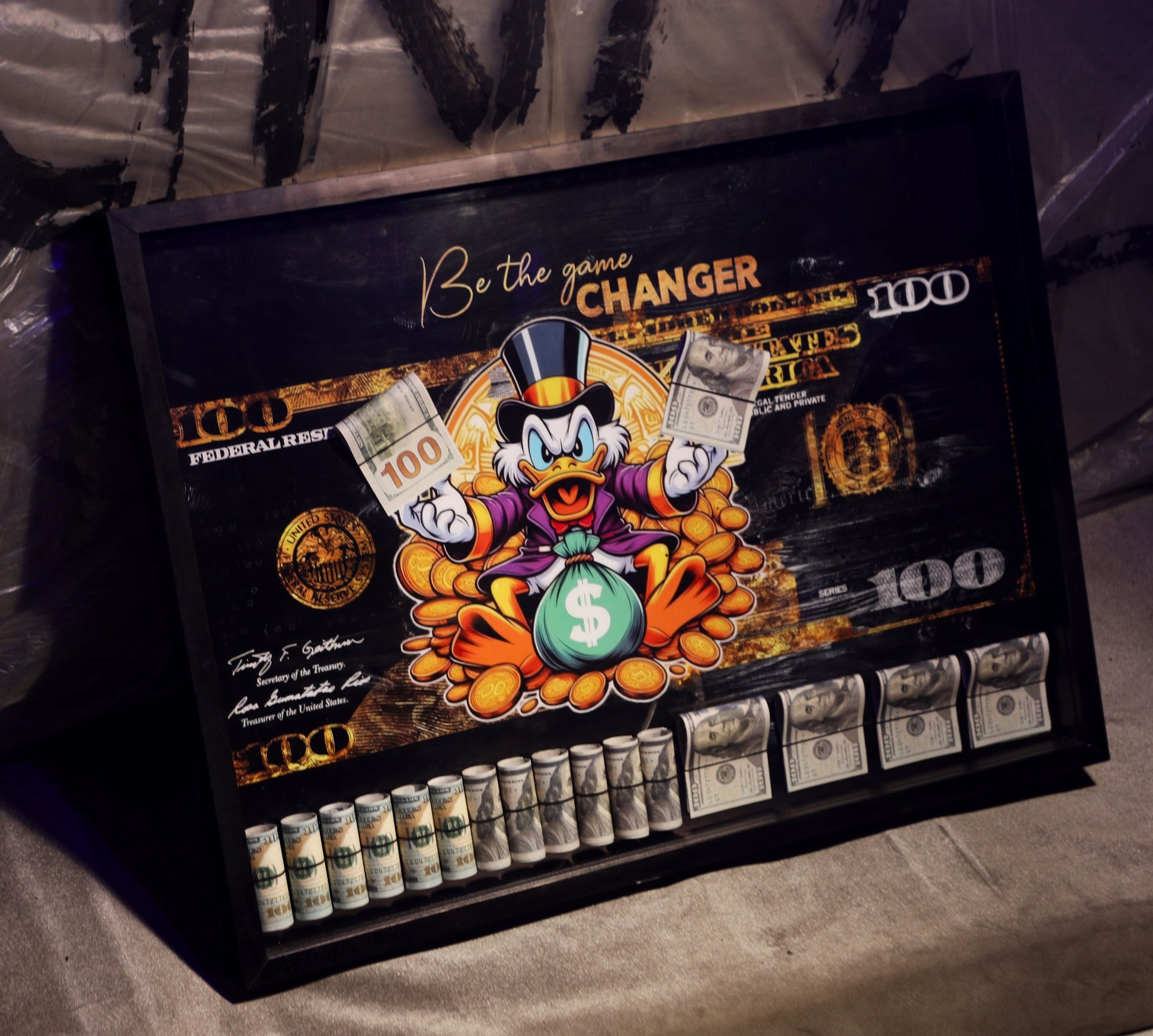 Featuring professionally arranged USD prop money and a premium clear acrylic front, this frame delivers a powerful, high-end visual impact.